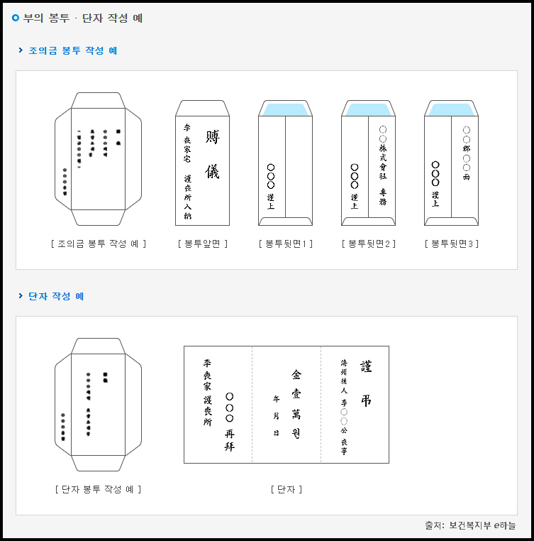 - ‘부의’, ‘조의’, ‘근조’ 등의 글자가 인쇄되어 있는 전용 부의봉투 사용 추천